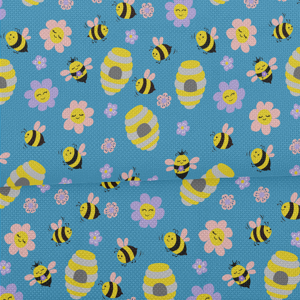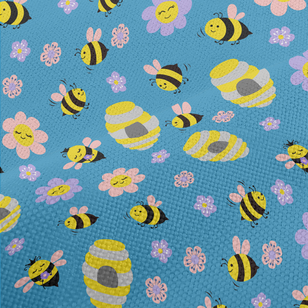 卡通蜜蜂和蜂窩花朵麻布(幅寬150公分)