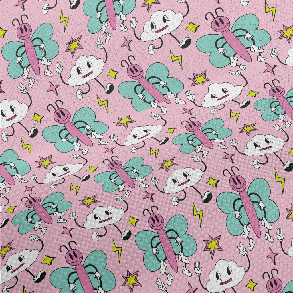 卡通粉色蝴蝶和雲朵麻布(幅寬150公分)