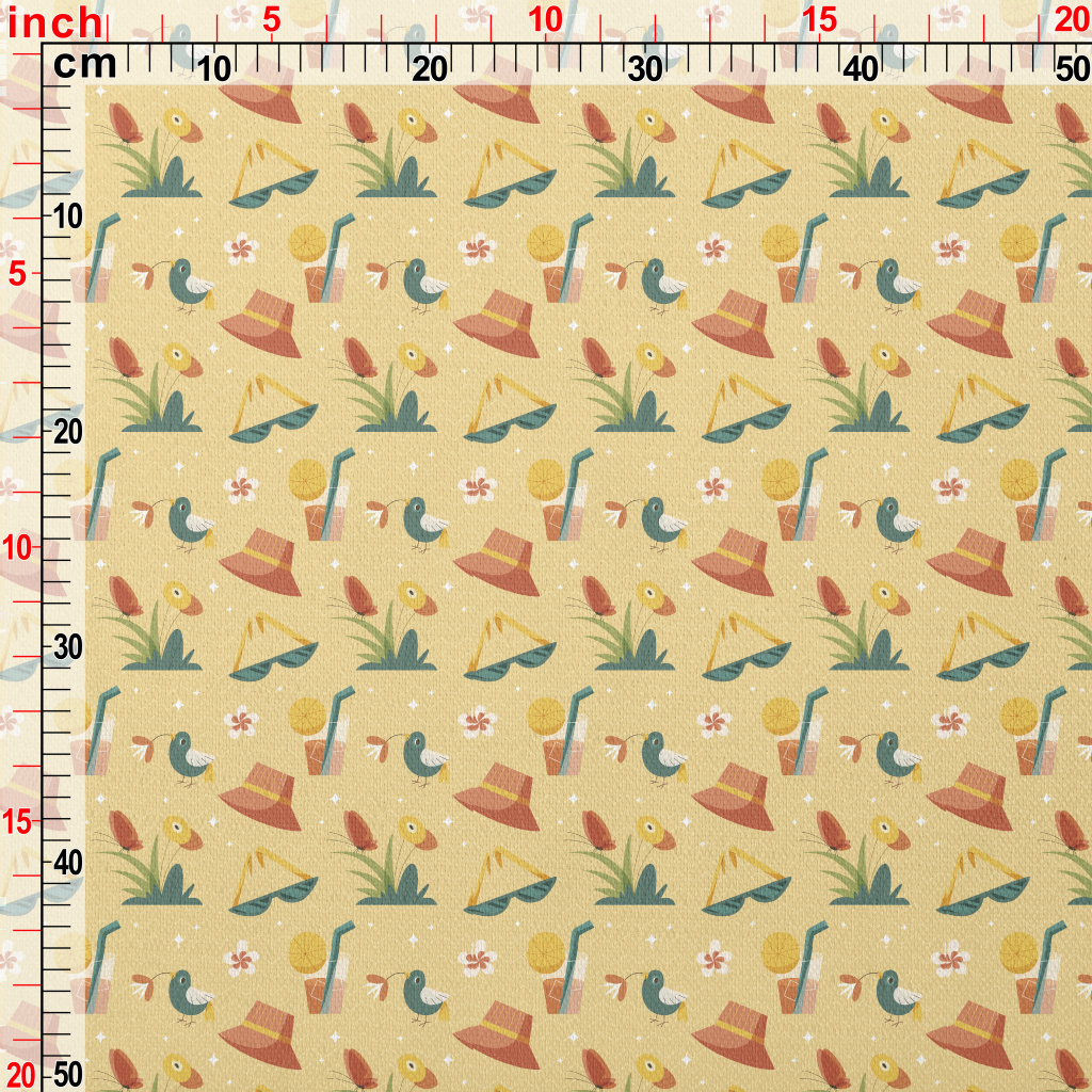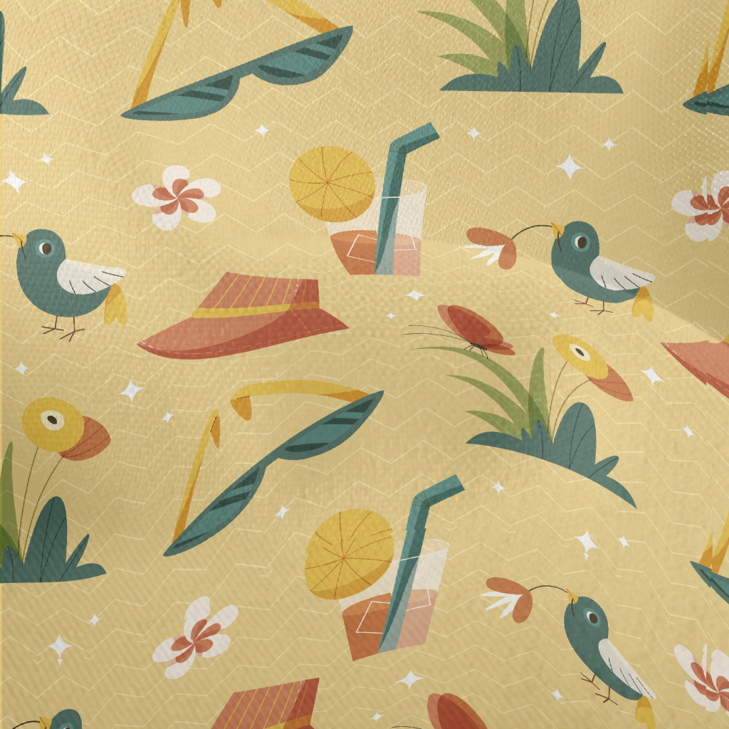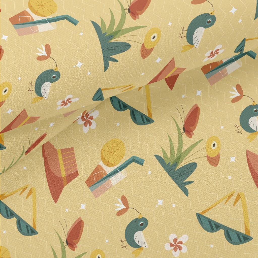 手繪小鳥蝴蝶果汁帽子花朵竹節麻(幅寬150公分)