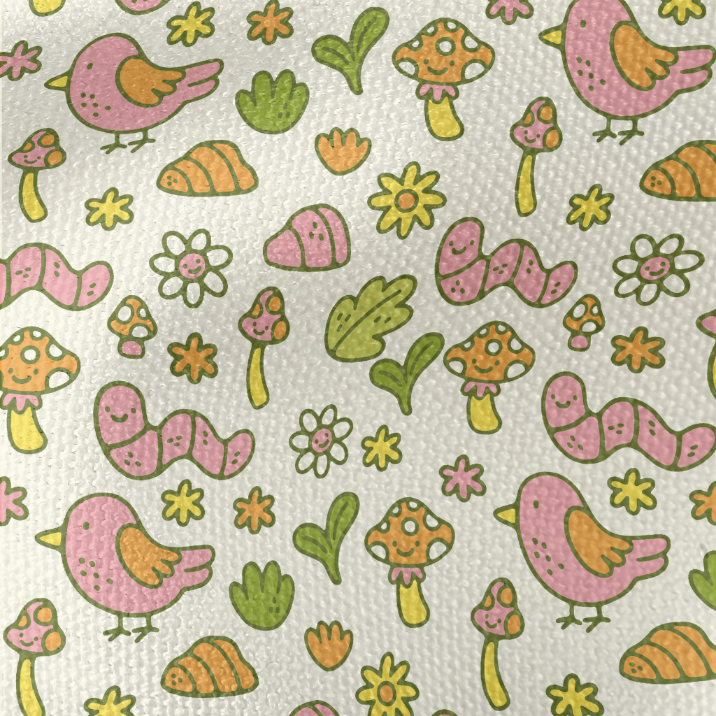 卡通蘑菇蚯蚓小鳥花朵帆布(幅寬150公分)
