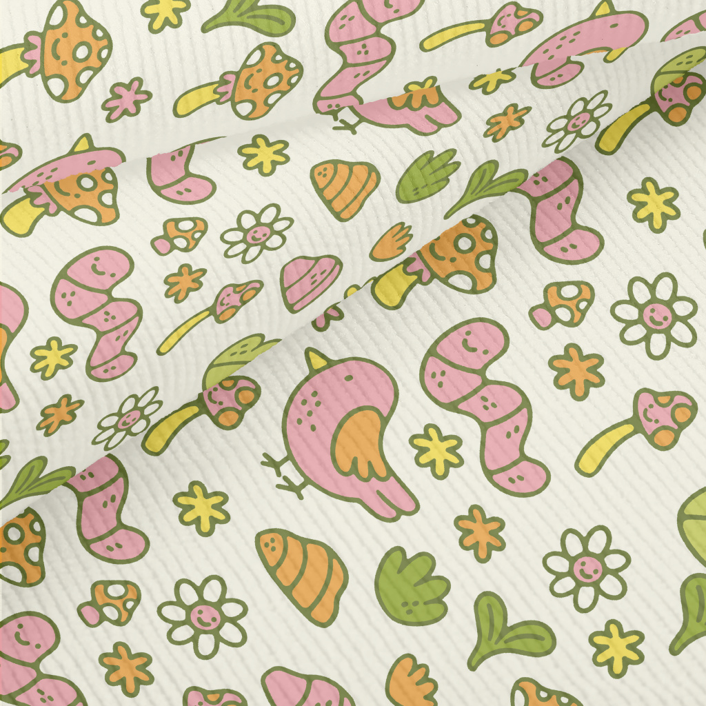 卡通蘑菇蚯蚓小鳥花朵燈芯絨(幅寬150公分)