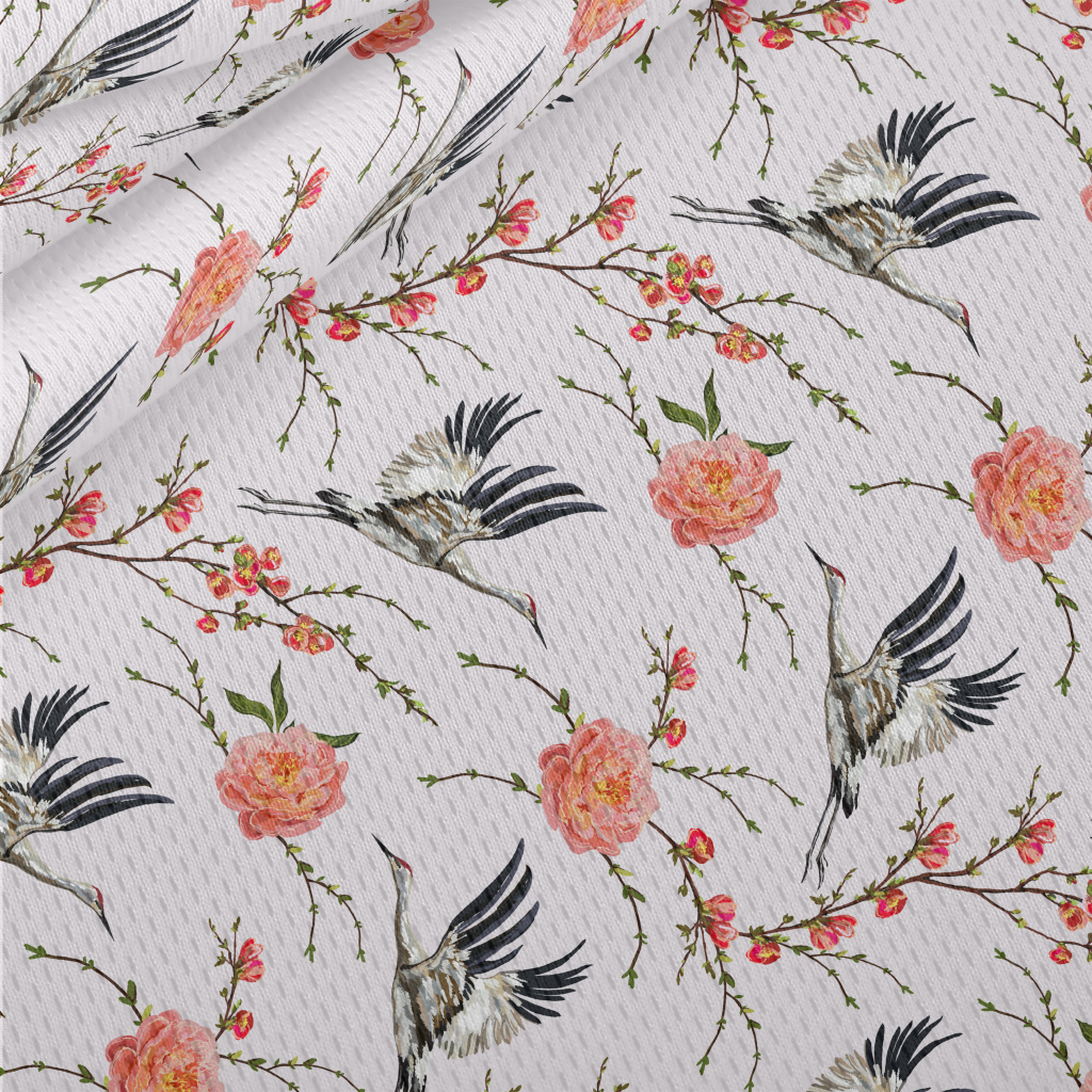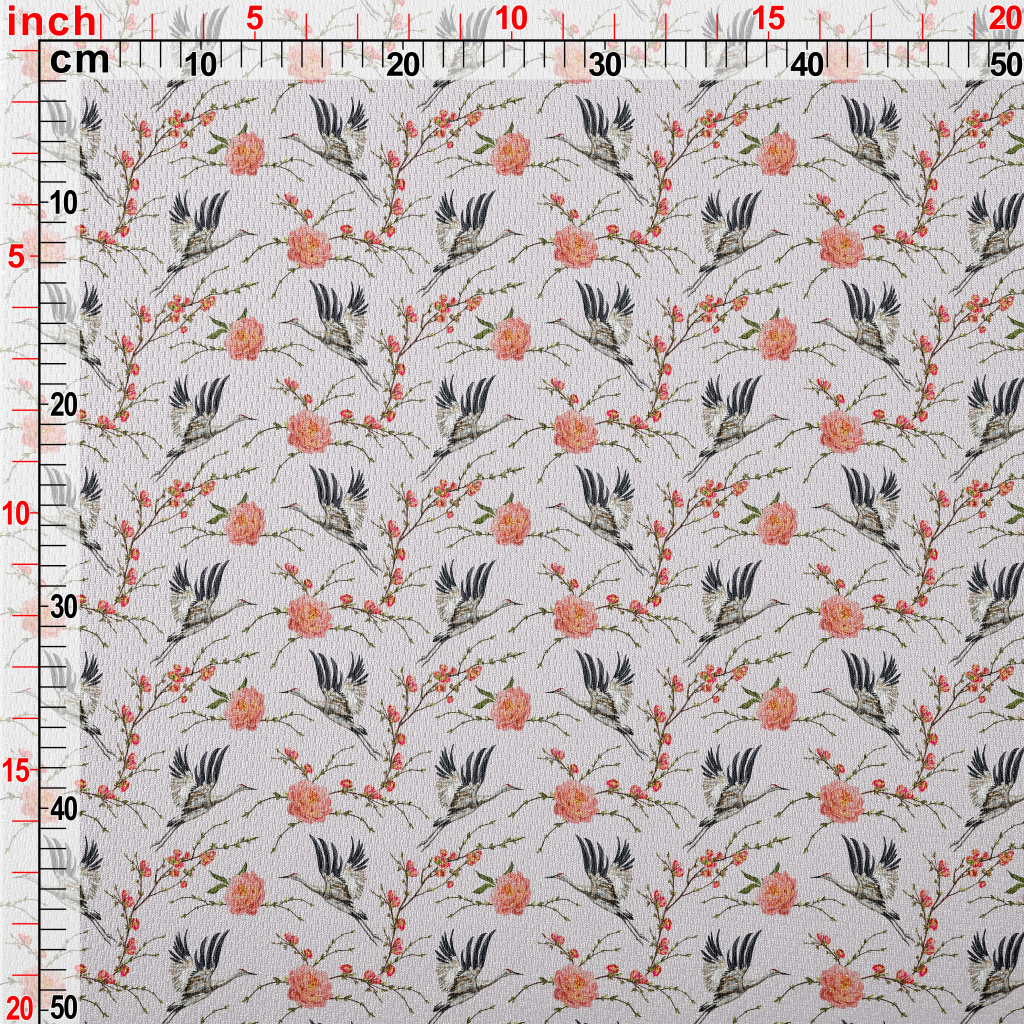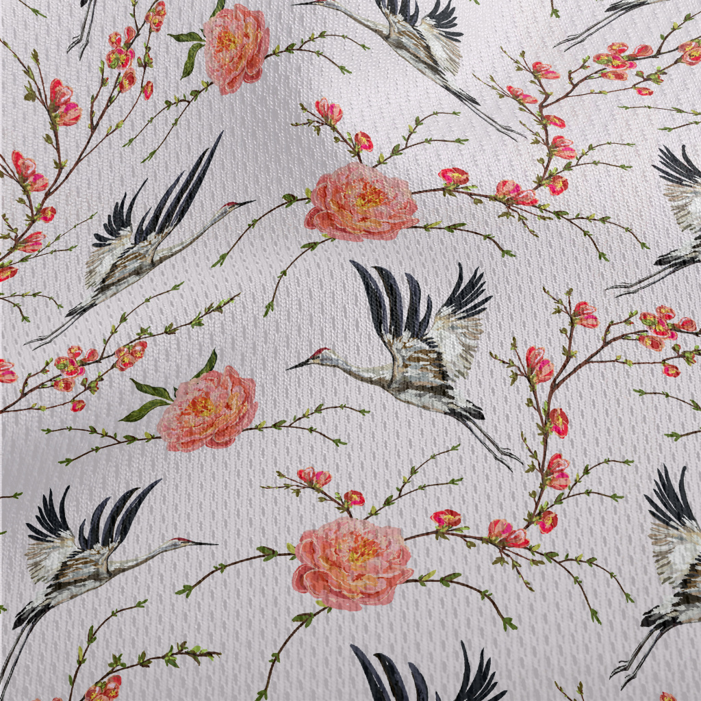 花卉與飛行的丹頂鶴鳥眼布(幅寬160公分)