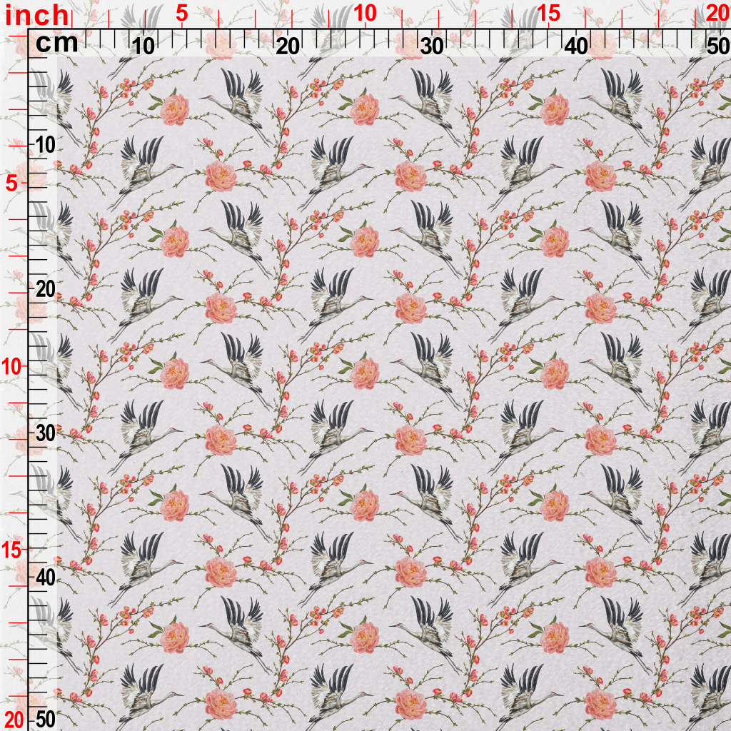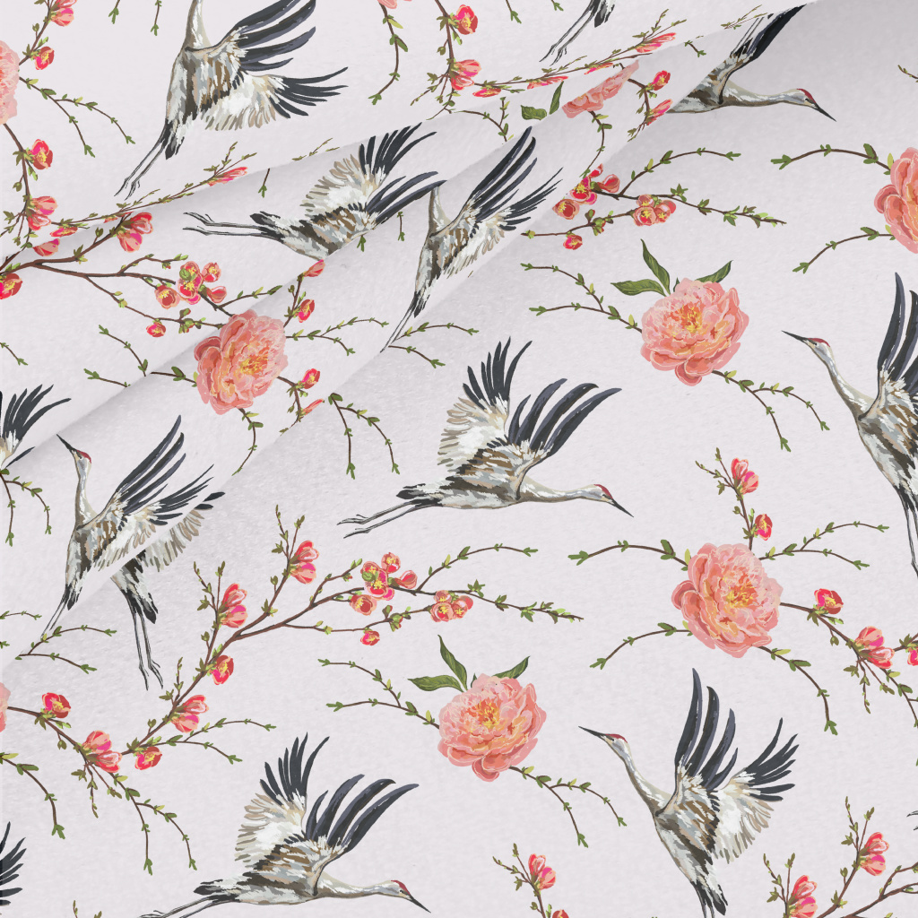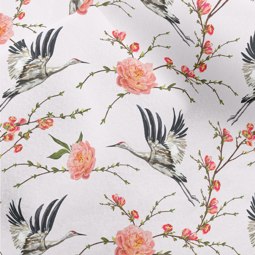 花卉與飛行的丹頂鶴水晶絨(幅寬160公分)