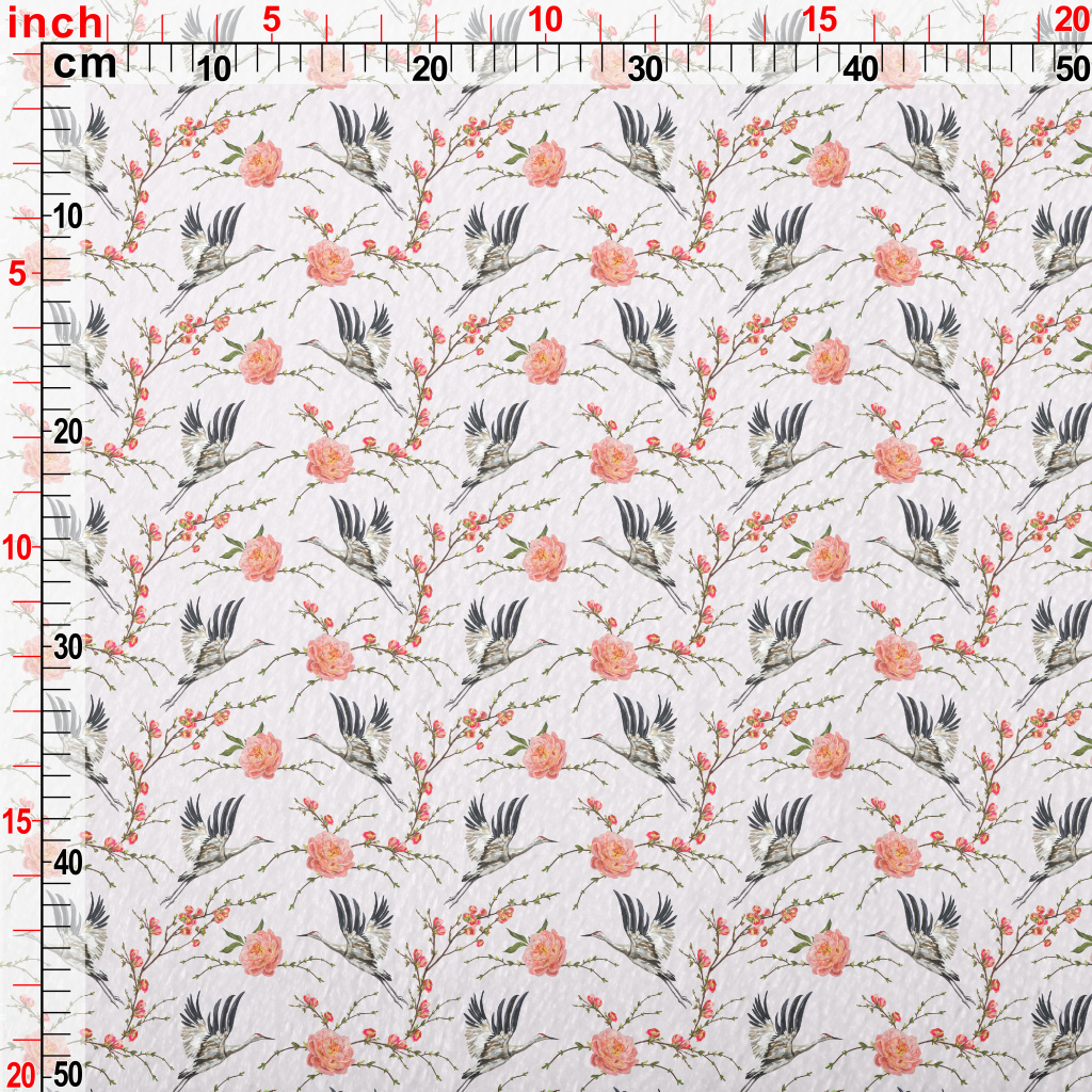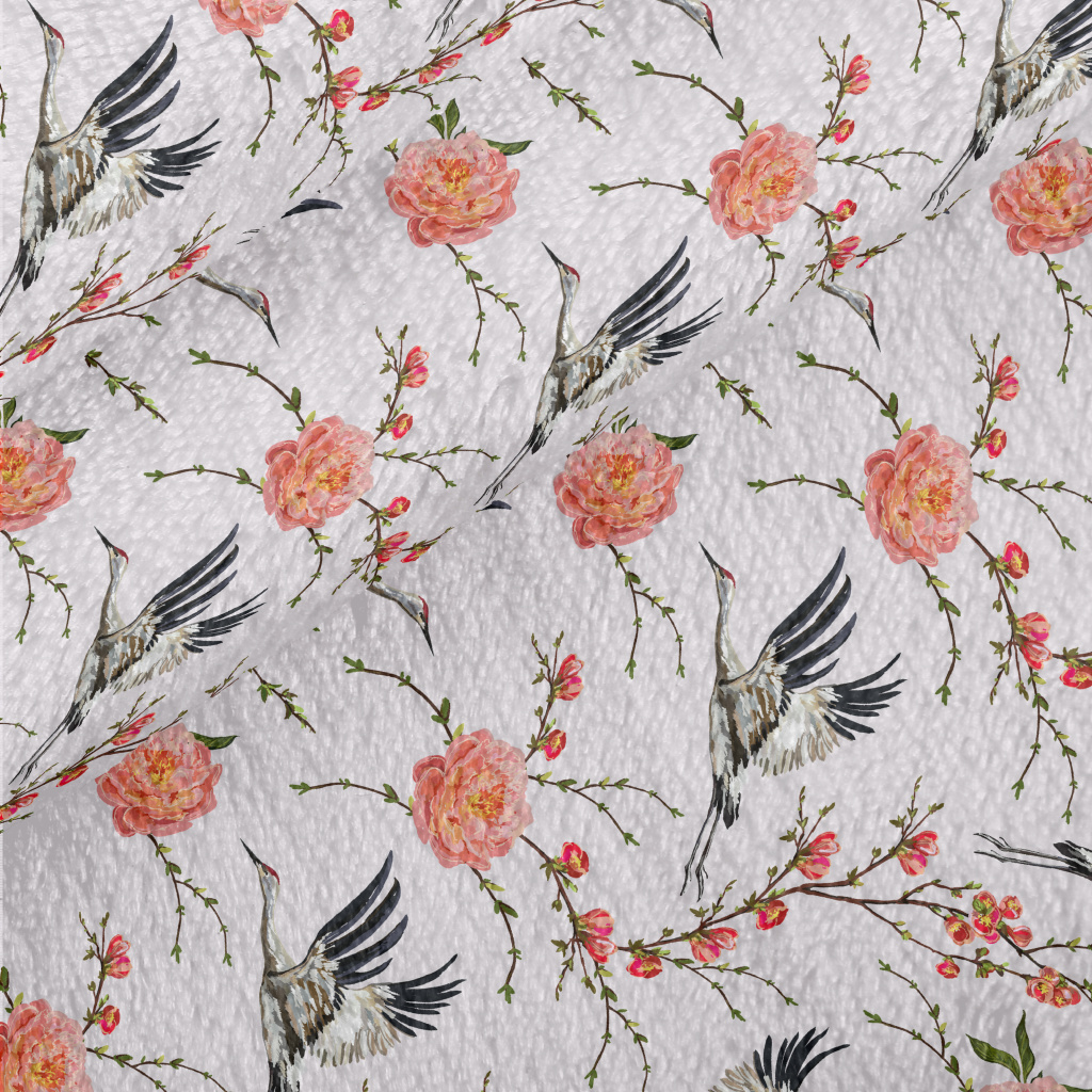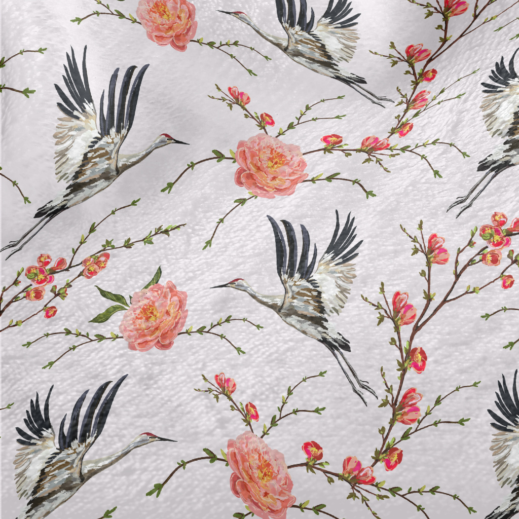 花卉與飛行的丹頂鶴法蘭絨(幅寬150公分)