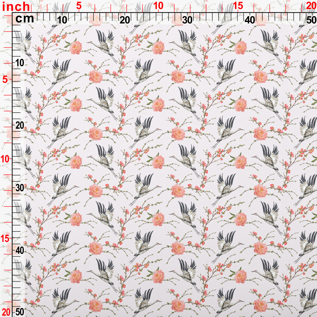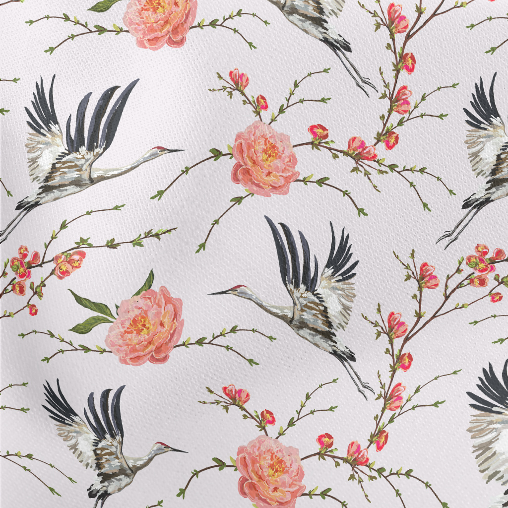 花卉與飛行的丹頂鶴薄棉布(幅寬150公分)