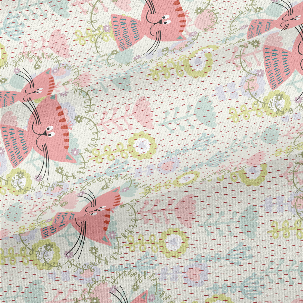 花叢裡的粉色貓咪雪紡布(幅寬150公分)