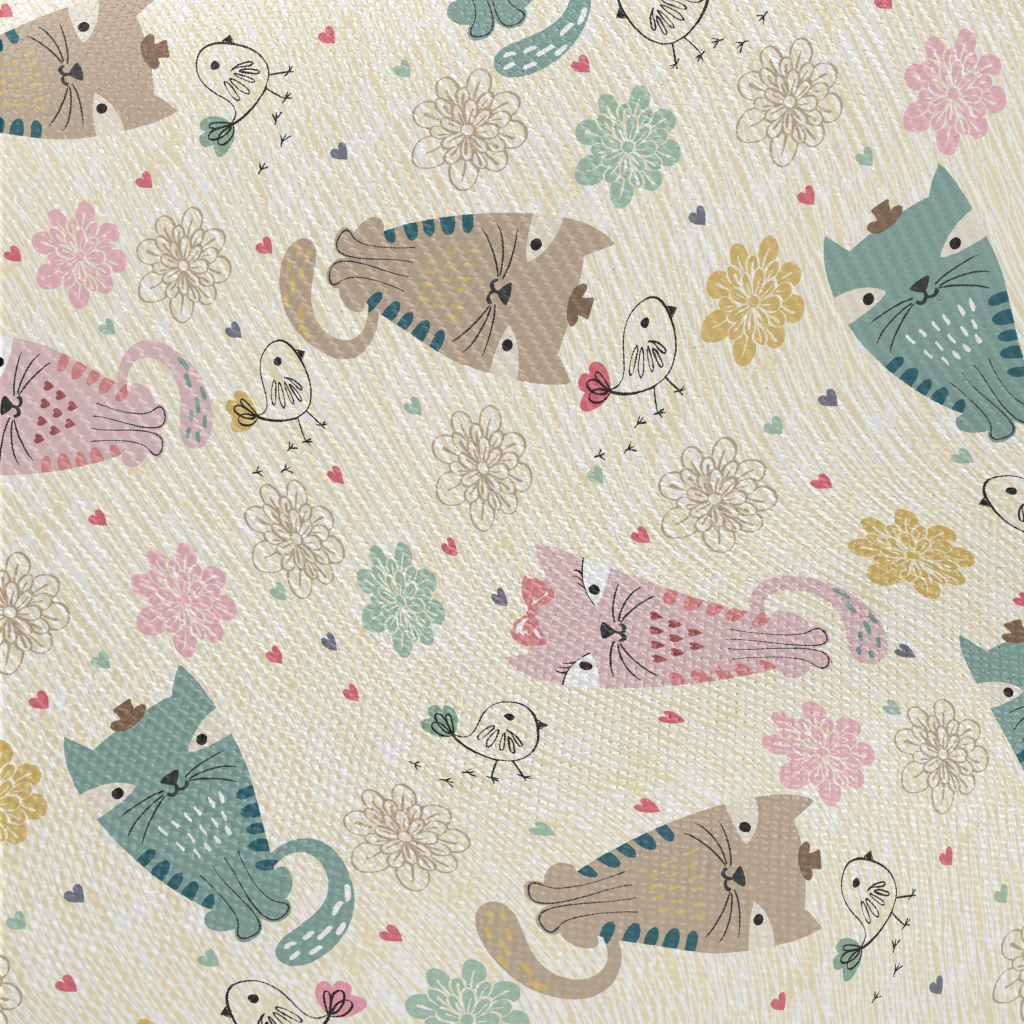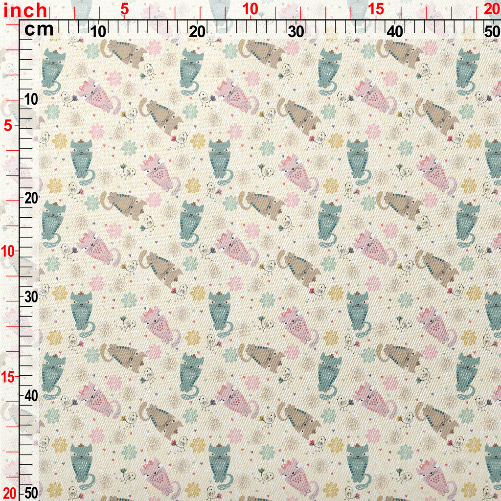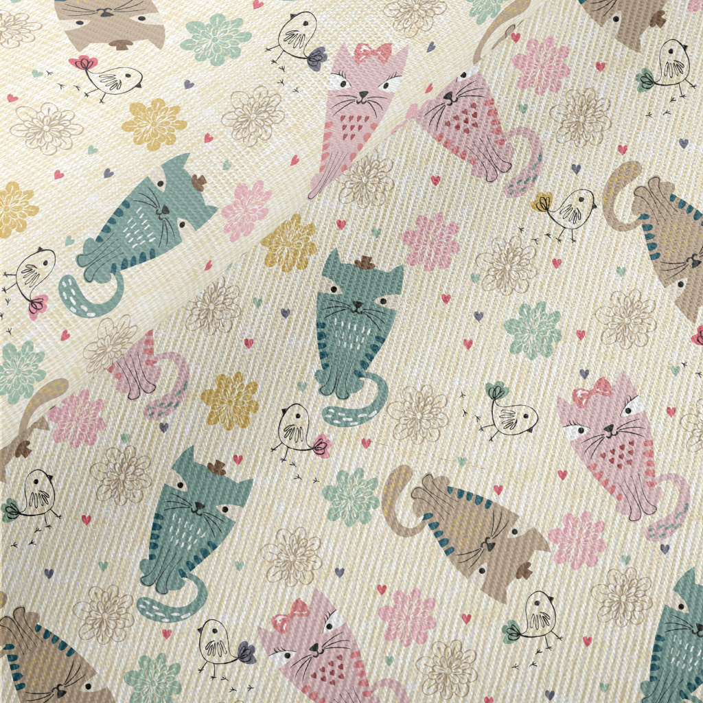 彩色貓咪和線條小鳥厚棉布(幅寬150公分)