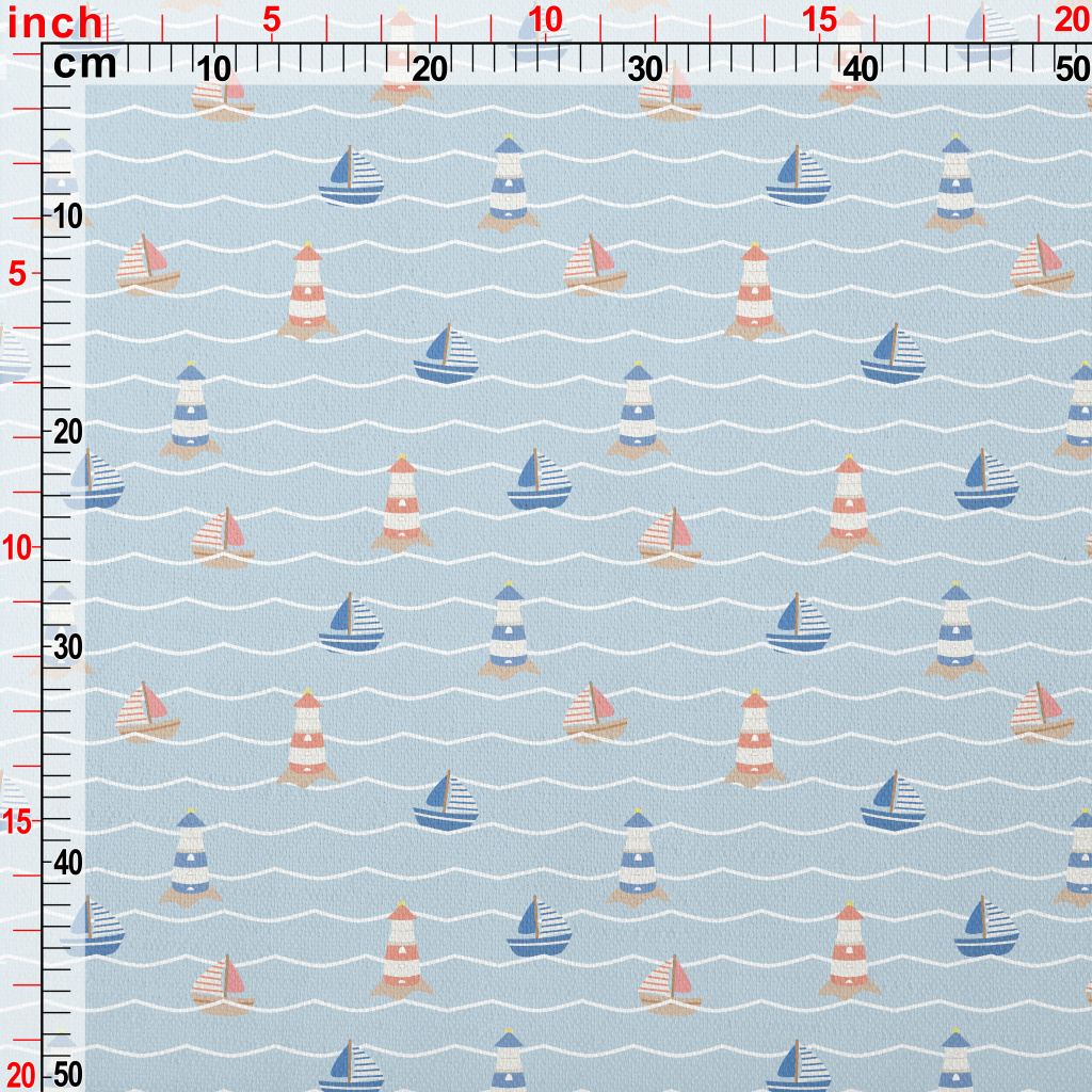 紅藍色帆船與燈塔竹節麻(幅寬150公分)